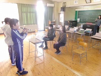 その後、お礼として今まで取り組んできた『茶色の小びん』の合奏をしてくれました。他の先生方も聴きに来てくれました。心地よい緊張感の中でとても軽やかでリズミカルな演奏ができました。校長先生もフルートで仲間に入れてもらいました。とても楽しくみんなと演奏することができました。